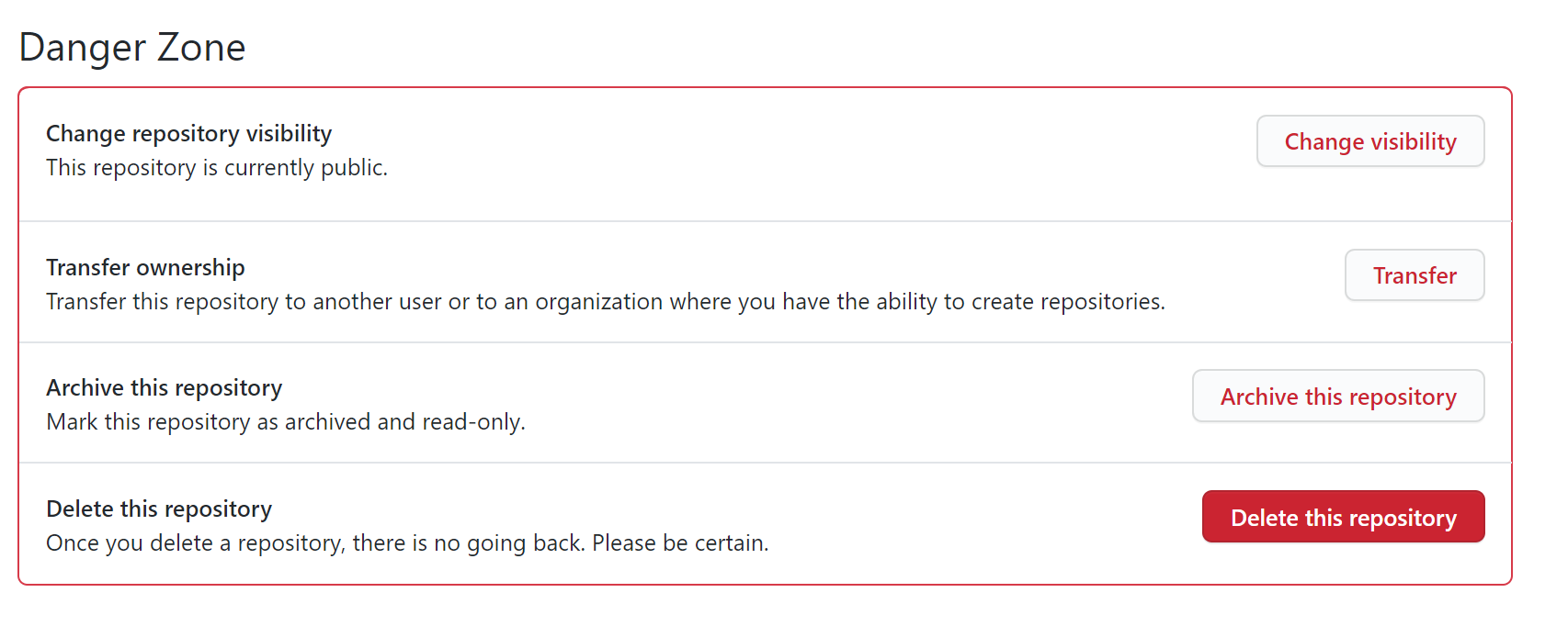 Danger Zone의 오른편 쪽의 delete this repository가 나옵니다.