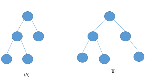 A : 왼쪽은 완전 이진트리 이다. B: 오른쪽은 완전이진 트리가 아니다.