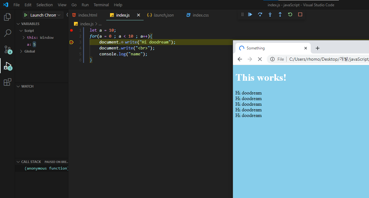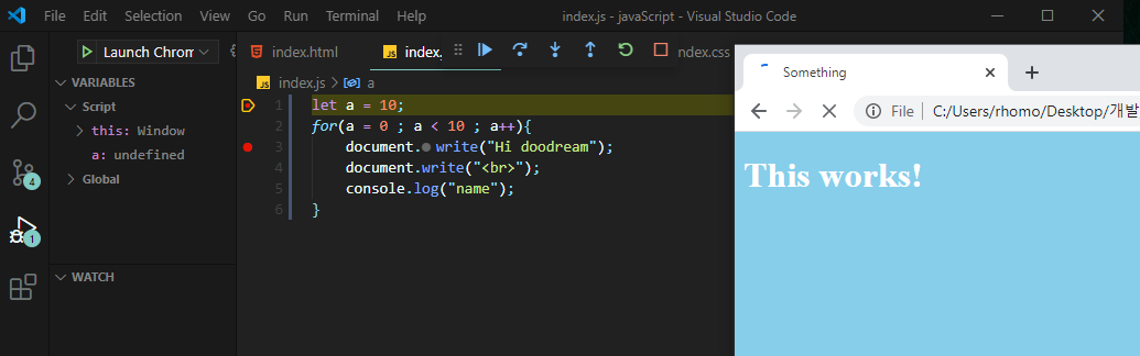 이후에 debug 버튼을 누르면 chrome에서 실행할 html파일을 선택한다.