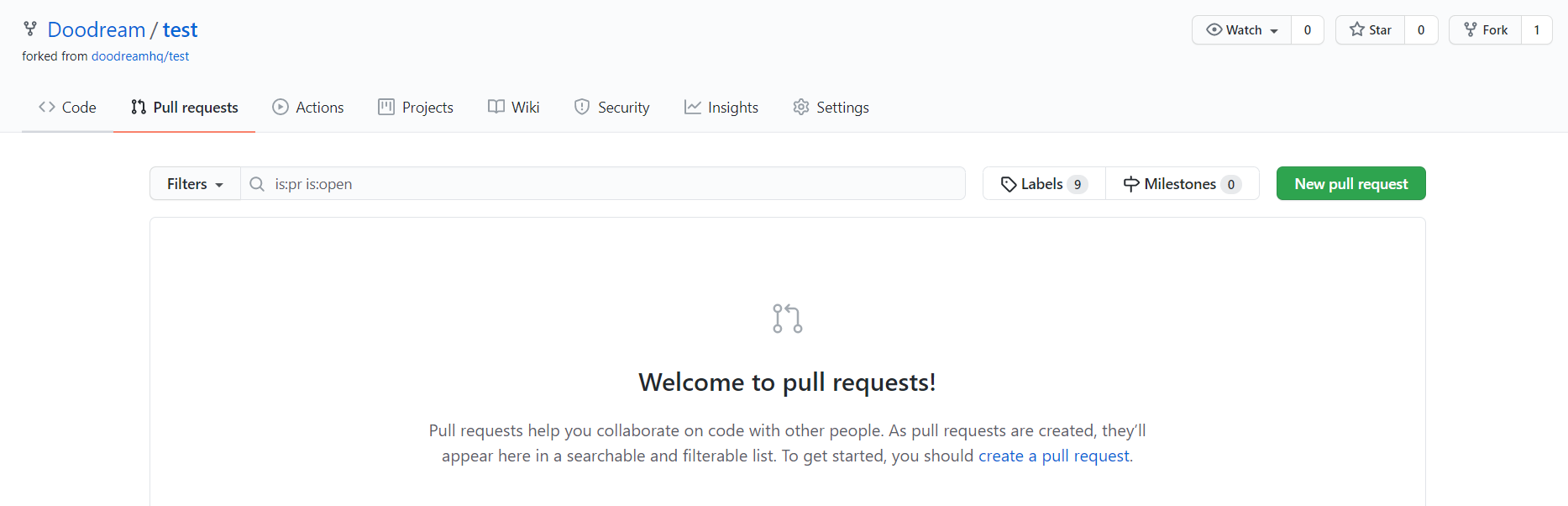 내가 fork한 레포지토리를 보면 헤드에 Pull requests 칸에 오른쪽 상단에 New pull request 버튼이 있다.