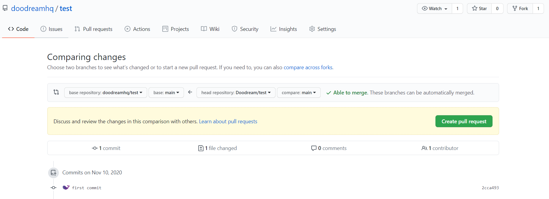 위와 같이 fork한 내 레포지토리에 push 된것을 알 수 있다. 이제 이것을 원본에 합쳐달라고 요청해보자