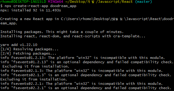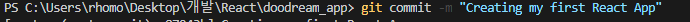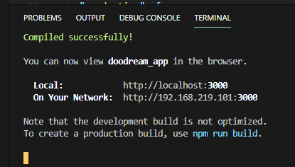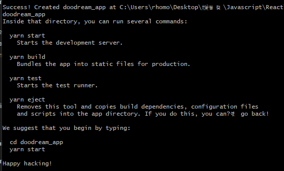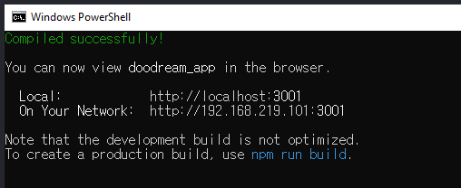 시간이 걸린다음 react app이 성공했다는 소리가 들린다.