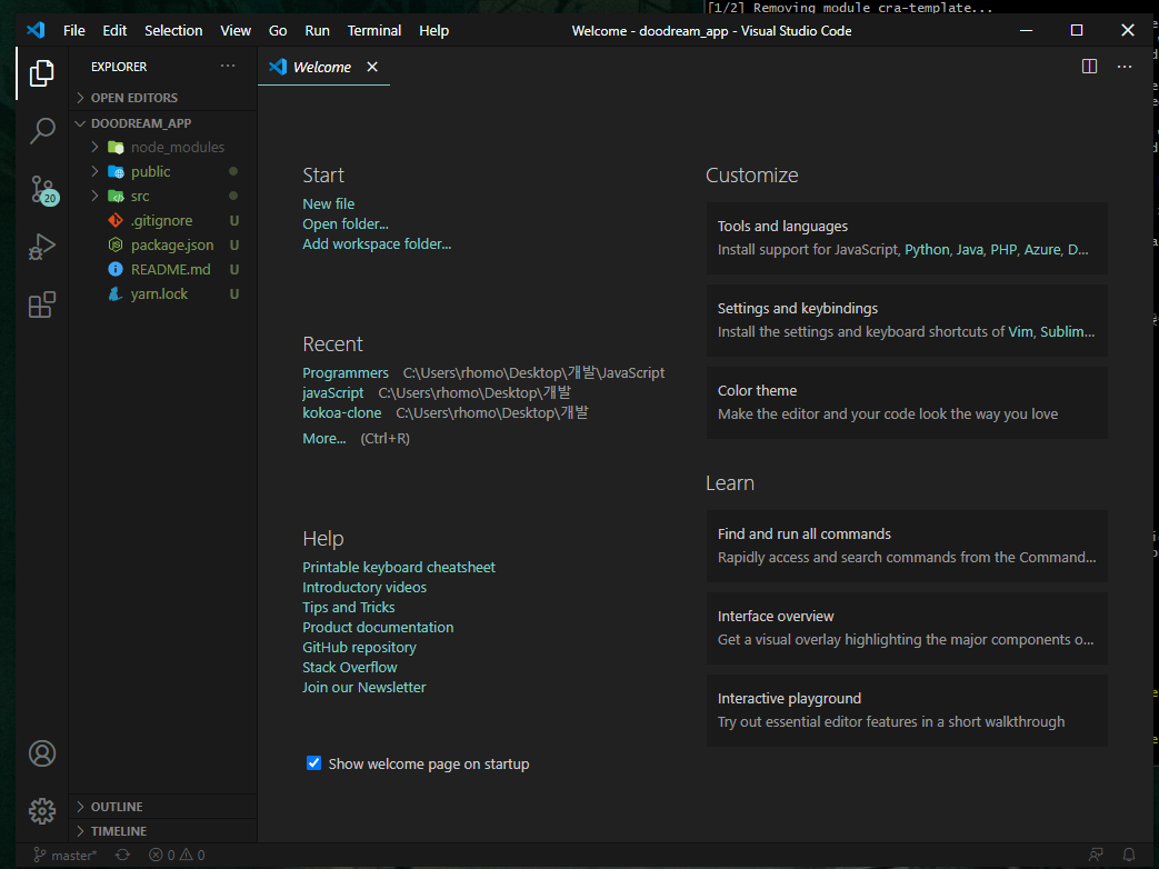| React - 1 개발환경구성 [VScode, node js, npm, yarn, npx] (0) | 2020.11.12 |