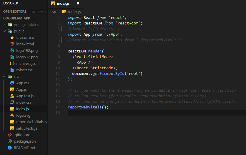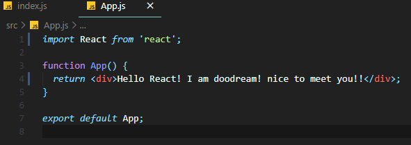이렇게 css파일들을 없애고 APP.js 와 index.js 파일의 코드 내용을 간소화 시켰습니다.