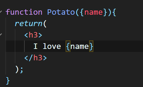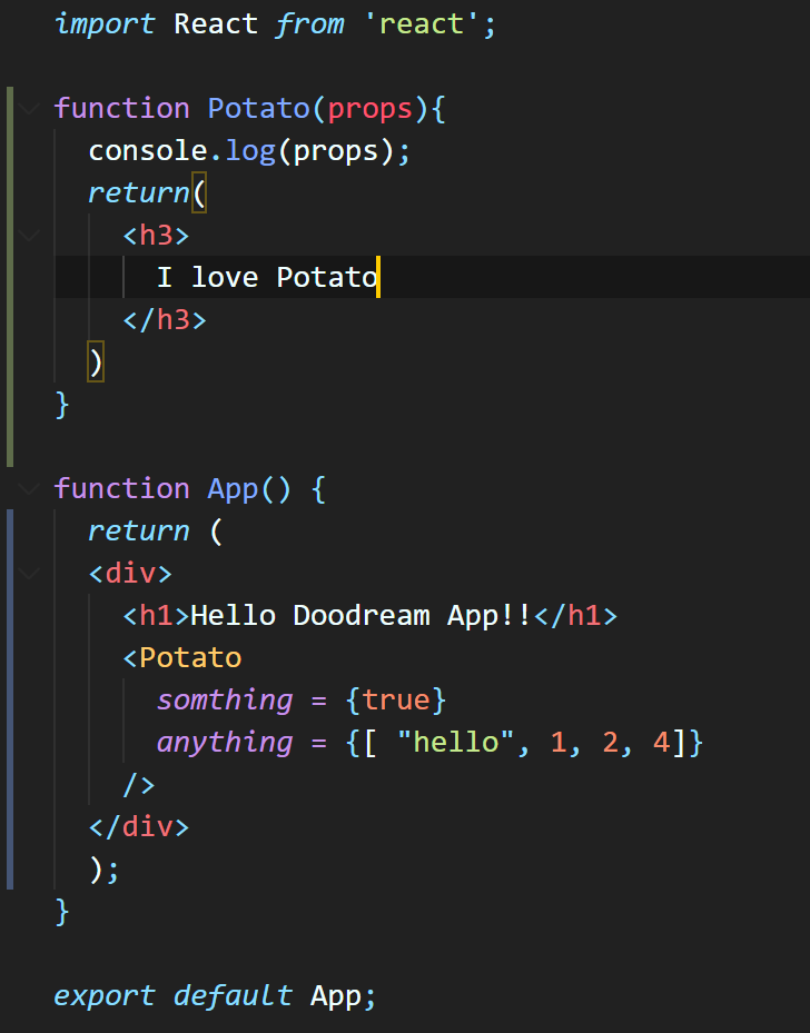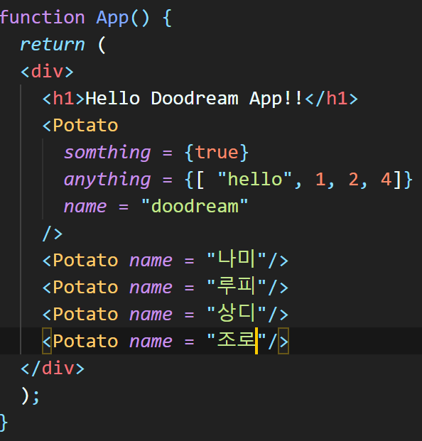 위 코드에서 APP() 컴포넌트에서 사용된 Potato 컴포넌트에는 여러 속성이 설정되었다.
