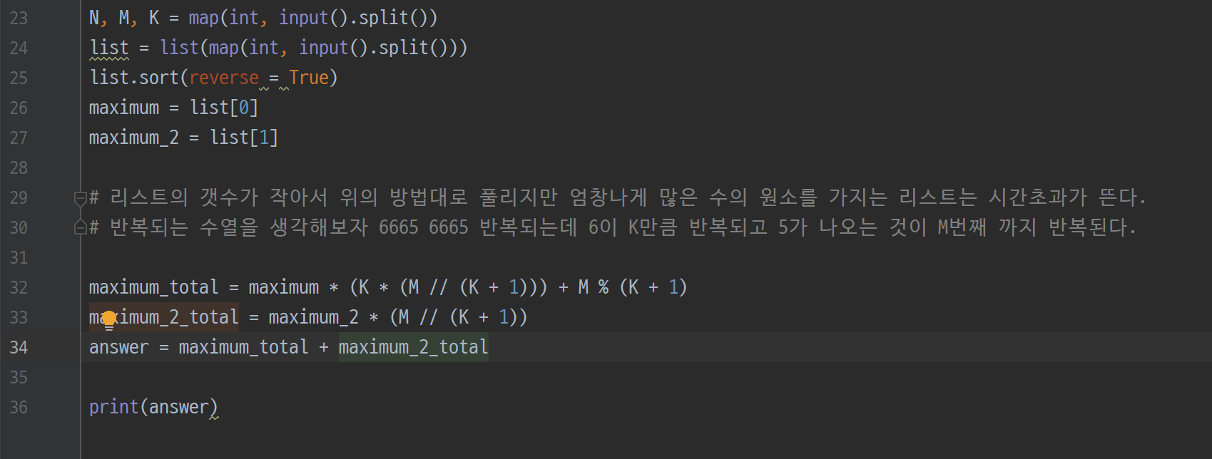 배열의 크기 N, 숫자가 더해지는 횟수 M, 그리고 K가 주어질 떄 동빈이의 큰수의 법칙에 따른 결과를