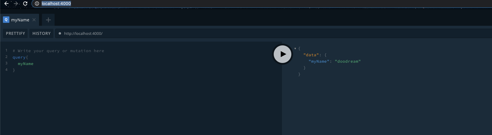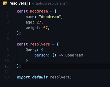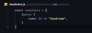 쿼리에서 name이라는 쿼리가 들어가면 "doodream" 을 반환하는 resolver를 프로그래밍 한 것이다.
