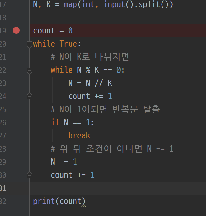 1. 먼저 N을 K로 나눌수 있을 때까지 나누고 N이 1이면 끝