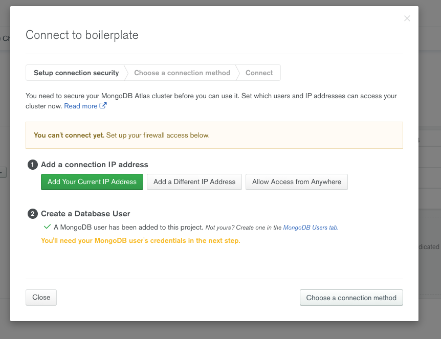 생성이 되면 connect 버튼을 클릭해서 mongoDB userID와 password를 생성합니다.