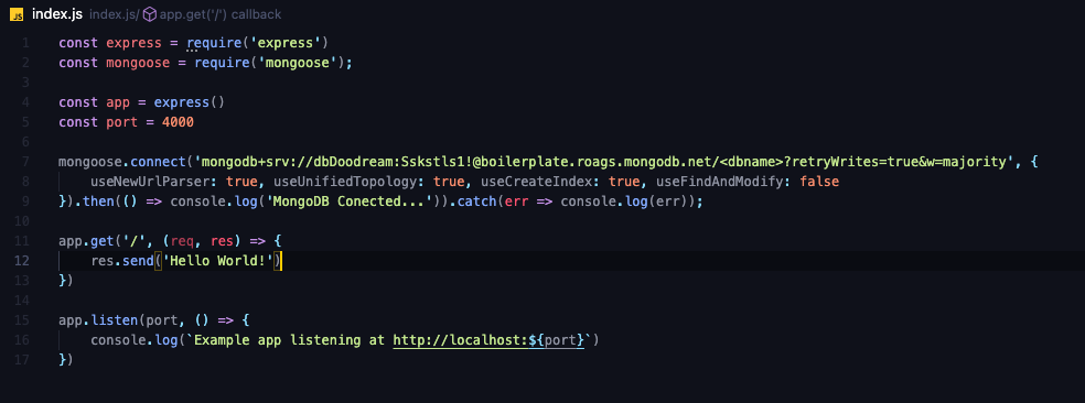 - mongoose.connect('위에 복사해놨던 부분을 붙여넣기 한후 <password> 부분을 mongoDB 비번을 생성했던 것으로 바꿔준다.', {