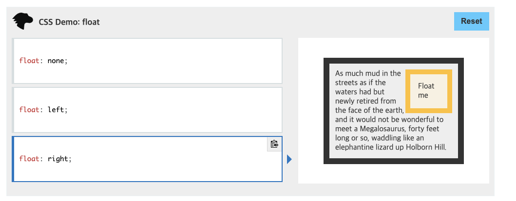 CSS 속성(property) float 은 한 요소(element)가 보통 흐름(normal flow)으로부터 빠져 텍스트 및 인라인(inline) 요소가 그 주위를 감싸는 자기 컨테이너의 좌우측을 따라 배치되어야 함을 지정합니다. The so