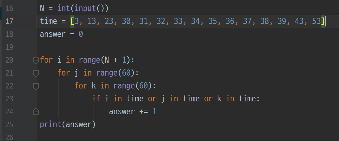 삼중 반복문으로 시간, 분, 초를 모두 돌려보며 조건문비교하는 단순 갯수세기문제이다.