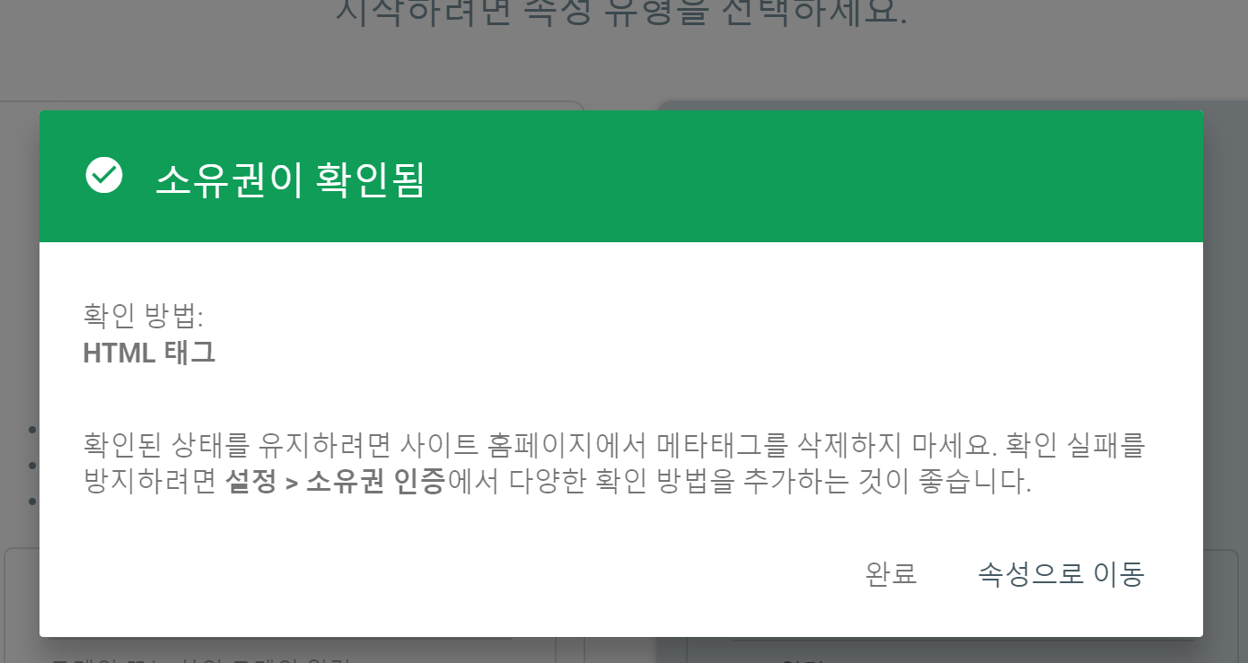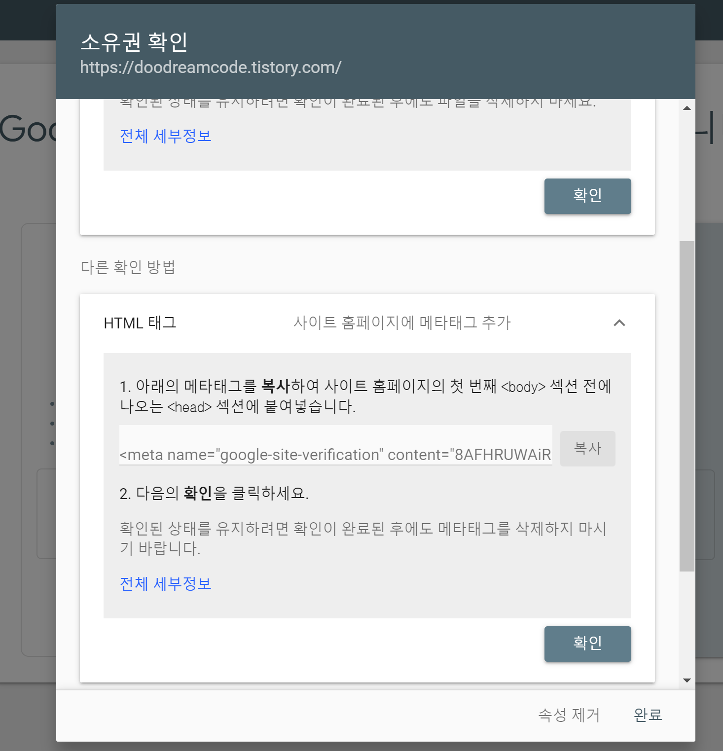 다시 웹마스터 도구로 돌아와 확인! 후 완료를 눌러주면