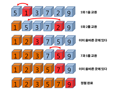 : 여러 데이터들중 가장 작은 데이터를 선택해 맨 앞에 있는 데이터와 바꾸고, 그다음 작은 데이터를 선택해 앞에서 두 번째 데이터와 바꾸는 과정을 반복하는 것