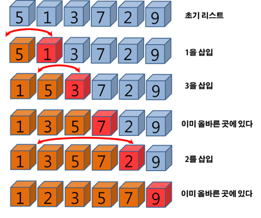 : 데이터를 하나씩 확인하며, 각 데이터를 적절한 위치에 삽입한다.