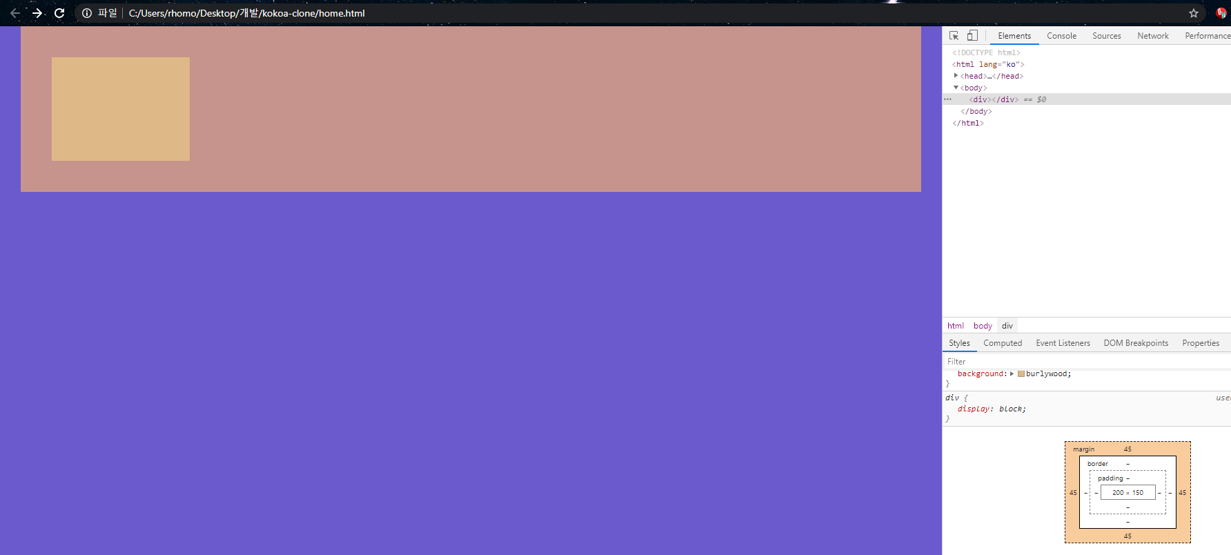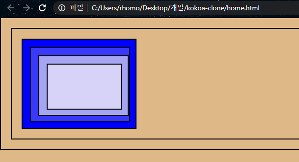 3가지 특성을 알아보기 위해서 html 파일전체의 배경색과 div의 배경색을 달리 설정해보자