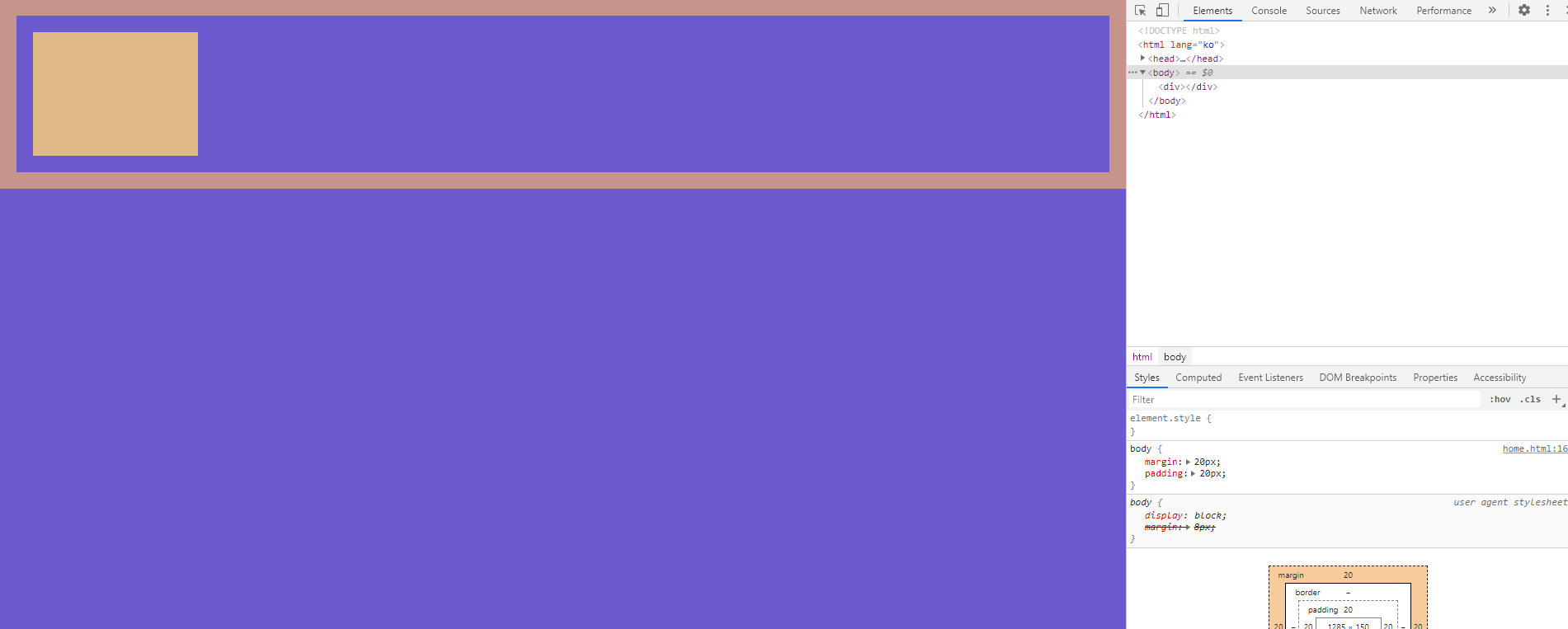 위 사진에 보면 body의 margin과 padding의 영역이 구분되어 있고 보인다.