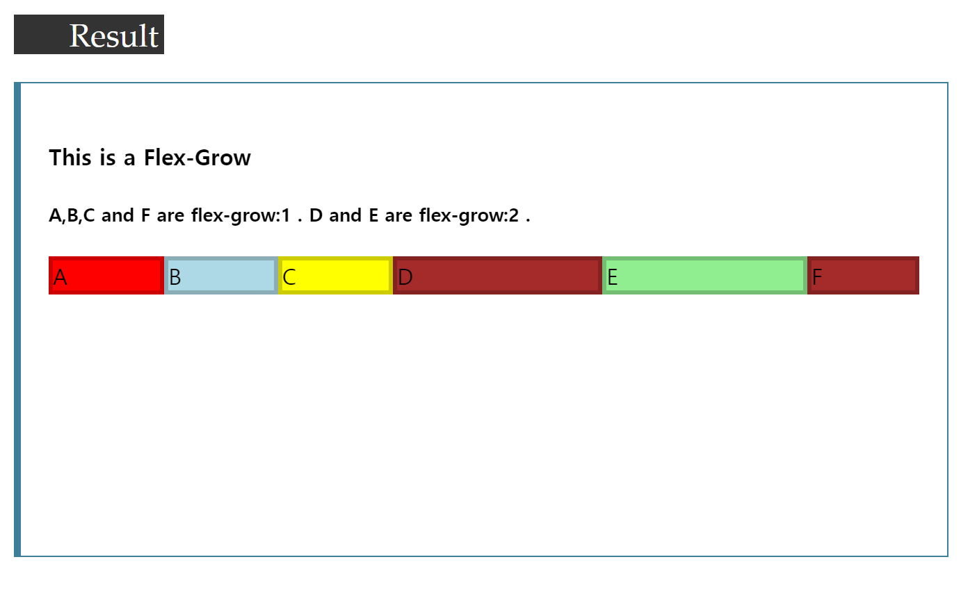 <h5>A,B,C and F are flex-grow:1 . D and E are flex-grow:2 .</h5>