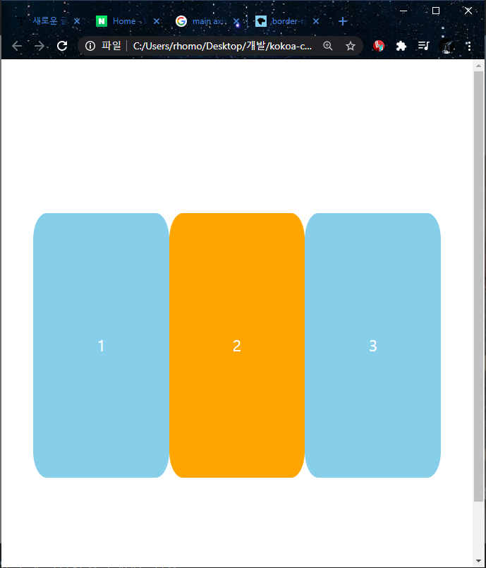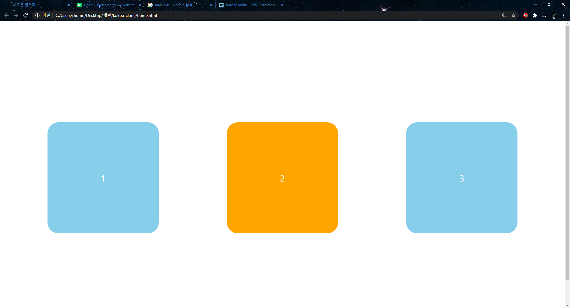 - space-evenly : 빈 공간을 같은 크기로 나누어서 배치(고르게 배치) 등