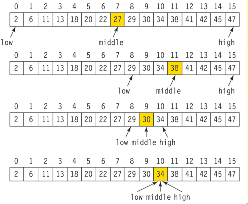 - 찾으려는 데이터와 정렬 된 리스트의 중간지점을 계속해서 재귀적으로 반복하며 비교해서 찾아내는 방법