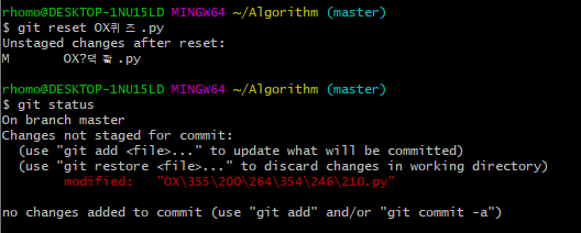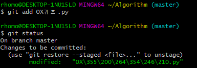 따라서 아직 OX퀴즈.py가 modified 상태이다.