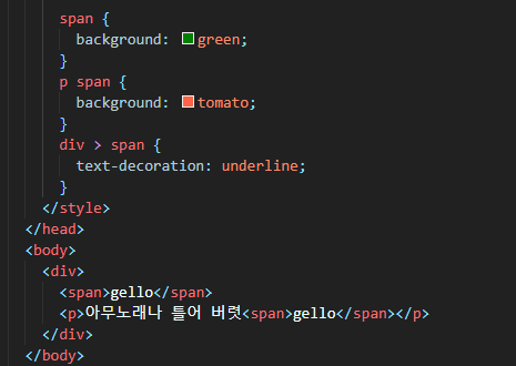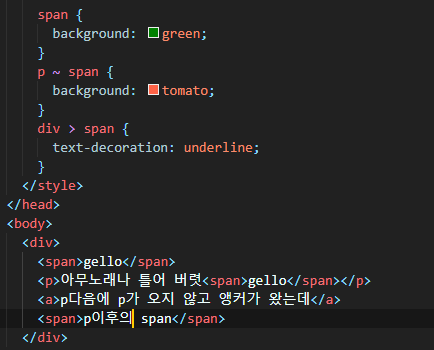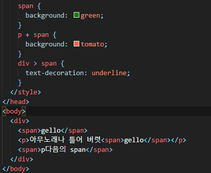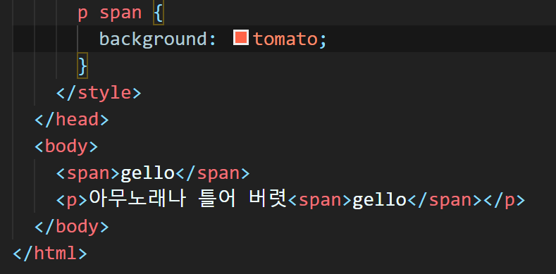 - 를 사용하여 p다음에 오는 span의 배경색을 토마토로 바꾸었다.