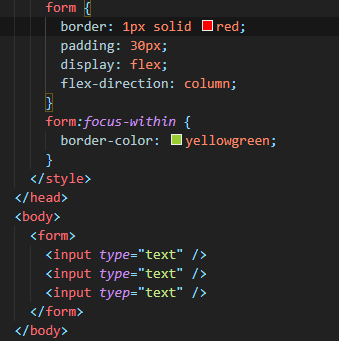 - 위와 같이 focus within은 부모에게 적용이되며 아래 input들중 하나라도 focus되면 form의 형태가 변하는 것이다.