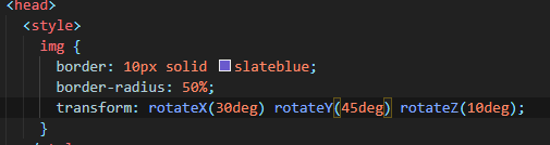- rotateX(각도) : 3d형태로서 x축을 각도만큼 돌린다. Y축과 Z축도 같고 동시에 사용이 가능하다.