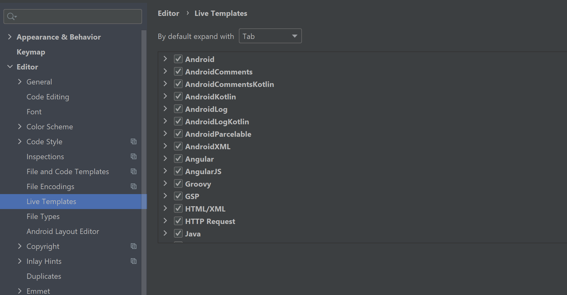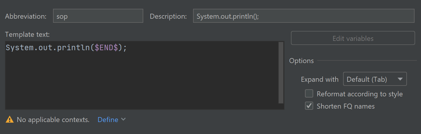 CTRL + ALT + S를 치면 나오는 설정창에 live templates으로 들어가면 자바에서 사용하는 template이 보인다.