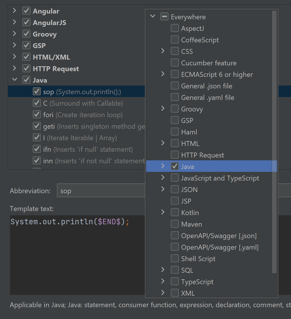 CTRL + ALT + S를 치면 나오는 설정창에 live templates으로 들어가면 자바에서 사용하는 template이 보인다.