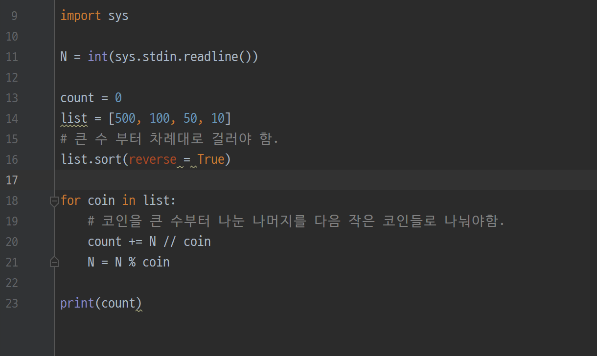 손님에게 거슬러 줘야 할 돈이 N원일 때 거슬러 줘야 할 동전의 최소 개수를 구해라.