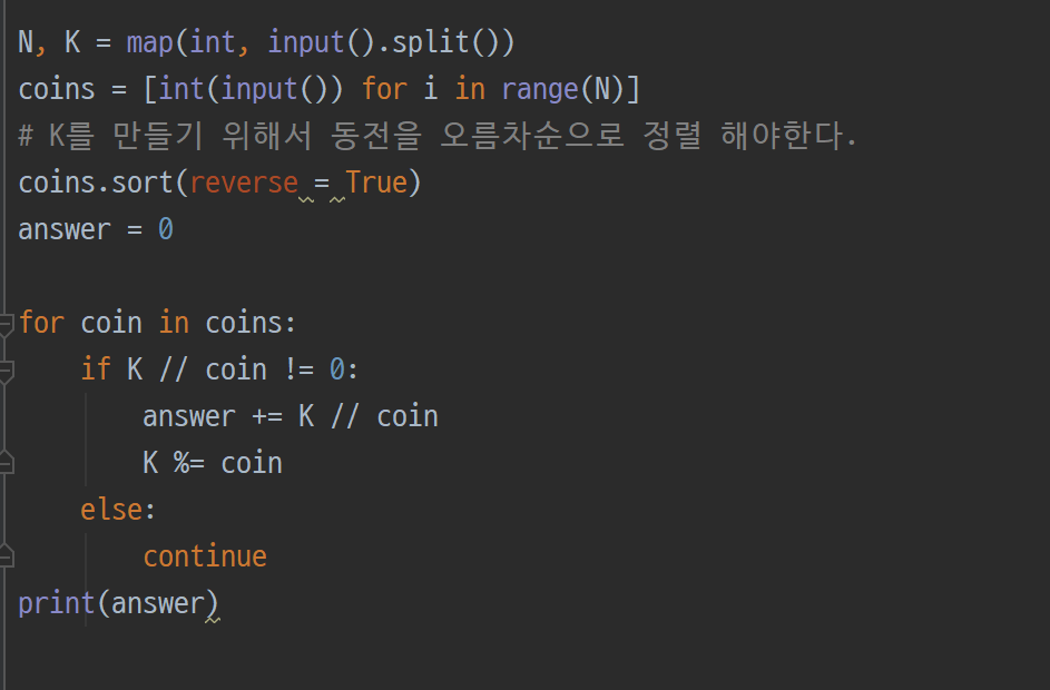 2. 코인이 K를 나눴을 때 몫이 0이지 않은 것만 동작하고 아닌 것은 넘어간다.